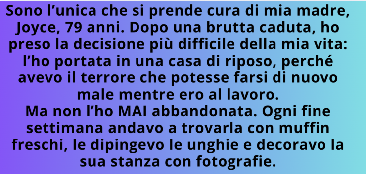 Sono l’unica che si occupa di mia madre, Joyce, 79 anni. Dopo una brutta caduta, ho dovuto prendere la decisione più difficile della mia vita: portarla in una casa di riposo.