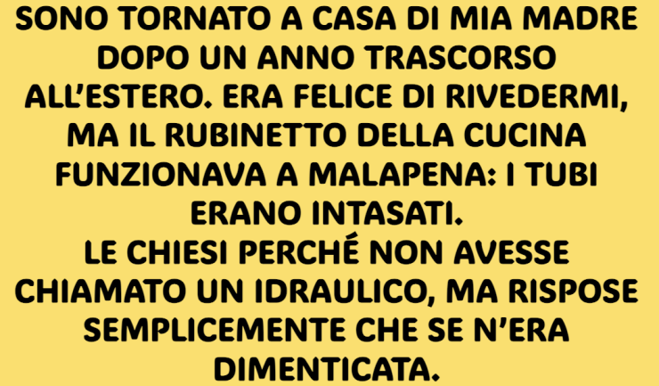 Sono tornato a casa di mia madre dopo un anno trascorso all’estero. Era felice di rivedermi, ma il rubinetto della cucina funzionava a malapena: i tubi erano intasati. Le chiesi perché non avesse chiamato un idraulico, e mi rispose che se n’era semplicemente dimenticata.