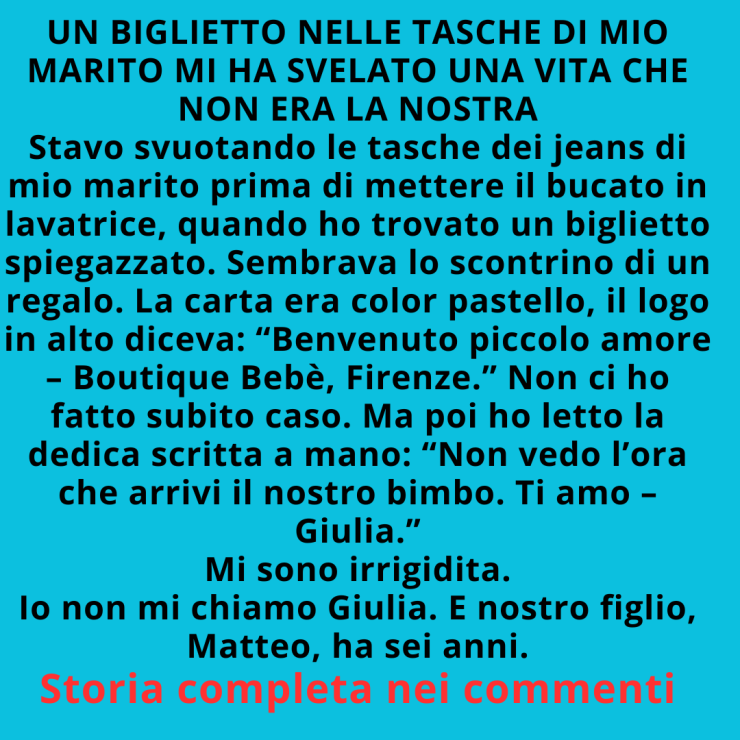 Stavo svuotando le tasche dei jeans di mio marito prima di mettere il bucato in lavatrice, quando ho trovato un biglietto spiegazzato. Sembrava lo scontrino di un regalo. La carta era color pastello, il logo in alto diceva: “Benvenuto piccolo amore – Boutique Bebè, Firenze.” Non ci ho fatto subito caso. Ma poi ho letto la dedica scritta a mano: “Non vedo l’ora che arrivi il nostro bimbo. Ti amo – Giulia.”