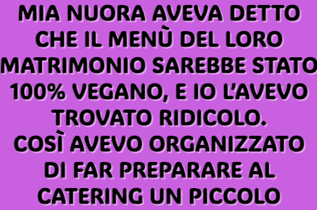 Mia nuora aveva detto che il menù del loro matrimonio sarebbe stato 100% vegano, e io l’avevo trovato ridicolo. Così avevo organizzato di far preparare al catering un piccolo angolo con della carne. Quando la mia nuora l’ha visto, le è venuto il bianco in faccia.
