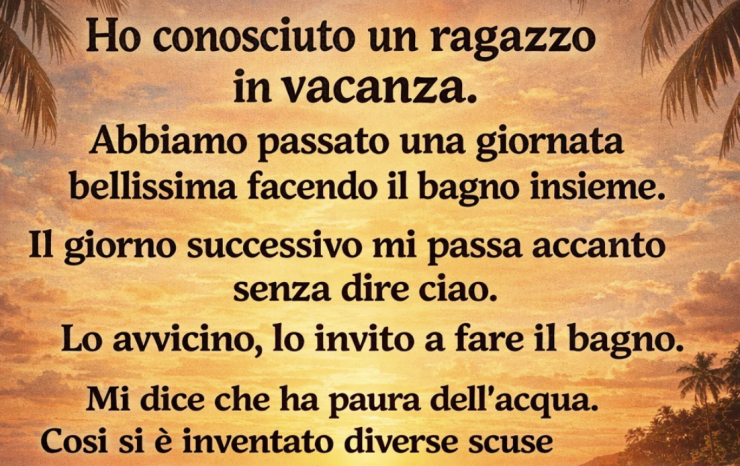L’ho conosciuto in vacanza. Un giorno meraviglioso: mare, sole, risate. Il giorno dopo, lui passa accanto a me e non mi saluta nemmeno. Lo raggiungo, lo invito a fare un bagno.