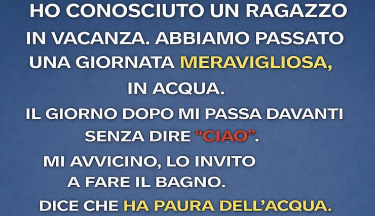 Ho conosciuto un ragazzo in vacanza. Abbiamo passato una giornata meravigliosa, tra nuotate e risate. Il giorno dopo, però, è passato davanti a me senza nemmeno salutare. Mi sono fatta coraggio, l’ho avvicinato e gli ho proposto di nuotare insieme.