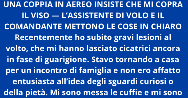 Recentemente ho subito gravi lesioni al volto, che mi hanno lasciato cicatrici ancora in fase di guarigione. Stavo tornando a casa per un incontro di famiglia e non ero affatto entusiasta all’idea degli sguardi curiosi o della pietà. Mi sono messa le cuffie e mi sono addormentata mentre gli altri passeggeri salivano a bordo.