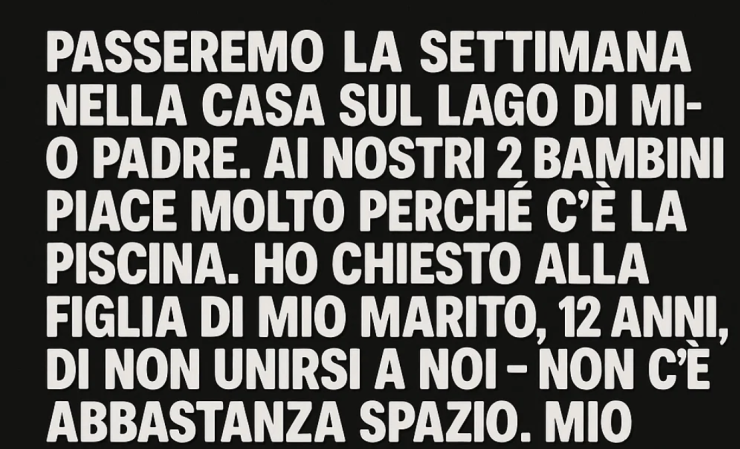 Passeremo la settimana nella casa sul lago di mio padre. Ai nostri 2 bambini piace molto perché c’è la piscina. Ho chiesto alla figlia di mio marito, di 12 anni, di non unirsi a noi — non c’è abbastanza spazio. Mio marito ha accettato e le ha detto: “Ti farò fare qualcosa di speciale dopo!” Una volta arrivati, abbiamo sentito un tonfo. Ho visto il volto di mio marito sbiancare mentre correva verso la porta d’ingresso.