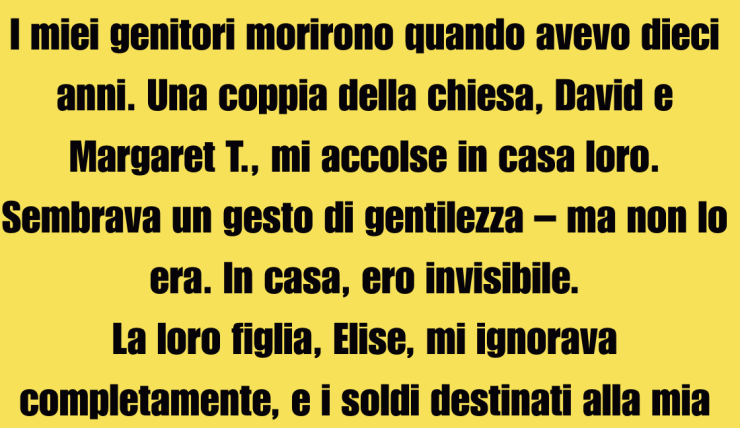 I miei genitori morirono in un incidente con fuga quando avevo dieci anni. Una coppia della chiesa, David e Margaret T., mi accolse. Sembrava un atto di bontà – ma non lo era. In casa, ero invisibile. La loro figlia Elise mi ignorava, e il denaro destinato alla mia cura finanziava il loro stile di vita: l’auto di Elise, viaggi di lusso, e donazioni alla chiesa per ricevere lodi. Hanno sperperato oltre 200.000 dollari. Margaret saccheggiò persino il negozio di antiquariato di mia madre, tenendosi un prezioso servizio di porcellana barocca che intendeva regalare a Elise. Ma io osservavo. Tracciavo tutto – OGNI SINGOLO DOLLARO.