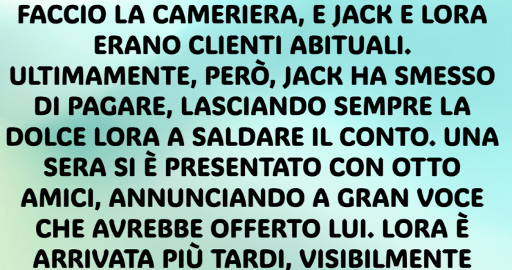 Faccio la cameriera, e Jack e Lora erano clienti abituali. Ultimamente, però, Jack aveva smesso di pagare: lasciava sempre la dolce Lora a saldare il conto. Una sera, si presentò con otto amici, dichiarando ad alta voce che avrebbe offerto lui. Lora arrivò più tardi, pallida in volto.