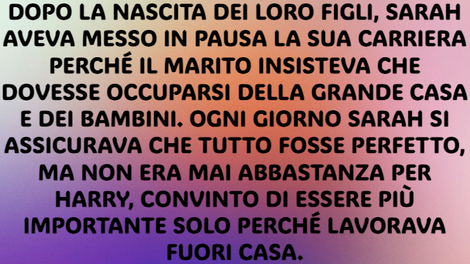 Dopo la nascita dei loro figli, Sarah aveva messo in pausa la sua carriera perché il marito insisteva che dovesse occuparsi della grande casa e dei bambini. Ogni giorno Sarah si assicurava che tutto fosse perfetto, ma non era mai abbastanza per Harry, convinto di essere più importante solo perché lavorava fuori casa.
