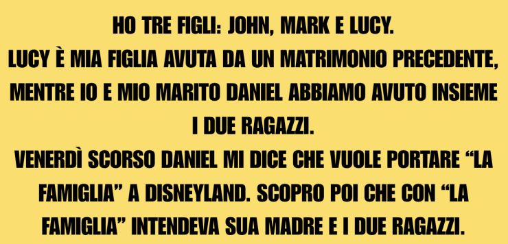 Quella volta, però, con “la famiglia” lui intendeva sua madre e i due figli maschi. Poi Lucy è entrata in cucina, tutta emozionata, e gli ha chiesto se poteva venire anche lei. Lui le ha risposto: “No, è solo per la FAMIGLIA.” Lucy è rimasta in silenzio.