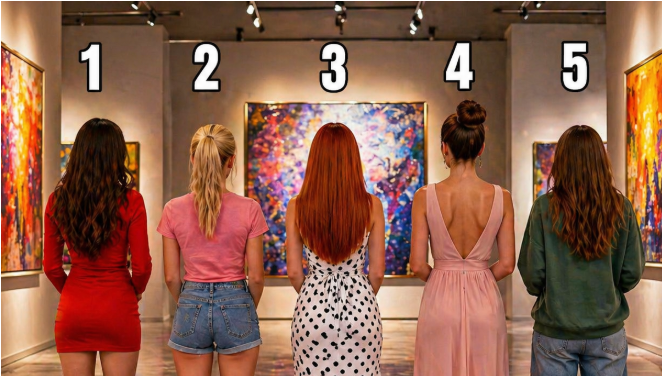 A prima vista, l’immagine sembra semplice: cinque donne in piedi una accanto all’altra in una galleria d’arte, ciascuna etichettata da 1 a 5. Ma la domanda sottostante —“Quale donna è la più attraente?”— trasforma tutto questo in qualcosa di molto più profondo. Non è proprio una questione di bellezza. Riguarda la percezione, la preferenza e la personalità.