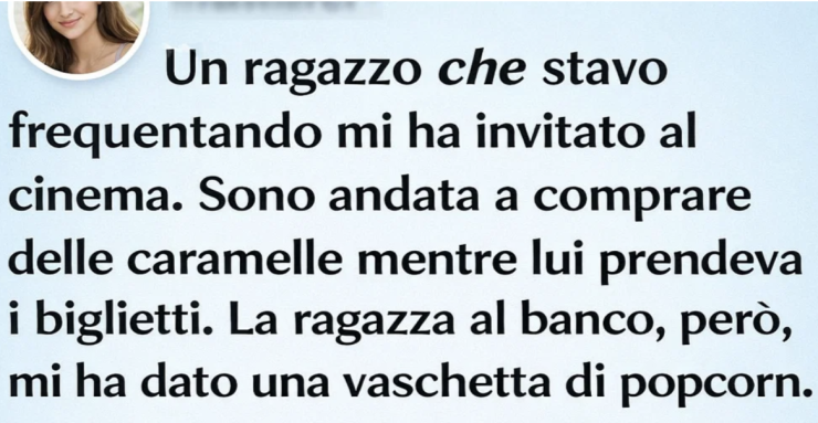 Quando mi ha vista, ha sorriso, mi ha consegnato il biglietto e ha detto che avrebbe preso i popcorn mentre io sceglievo qualche caramella.