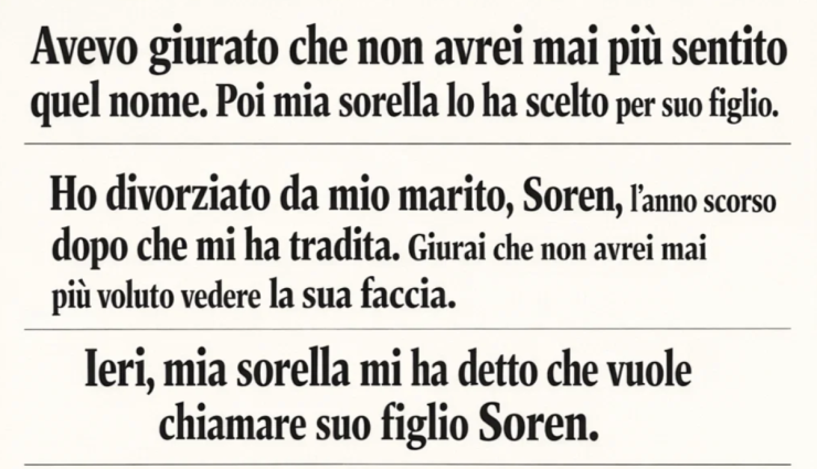 Ho divorziato da mio marito, Soren, l’anno scorso dopo che mi ha tradita. Giurai che non avrei mai più voluto vedere la sua faccia. Ieri, mia sorella mi ha detto che vuole chiamare suo figlio Soren.