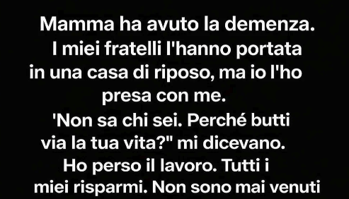 Ridussi le ore di lavoro. Poi persi completamente il lavoro quando la flessibilità smise di essere un’opzione. I miei risparmi scomparvero lentamente tra prescrizioni, mobili adattati, cibi speciali e piccoli cambiamenti che rendevano la casa più sicura e meno spaventosa per lei. Alcuni giorni erano gentili. Canticchiava melodie della sua giovinezza o sedeva in silenzio, guardando la polvere fluttuare nella luce del sole come se fosse qualcosa di magico. Altri giorni erano pesanti — pieni di agitazione, domande che non riusciva a finire, e occhi in cerca di risposte che non avevo.