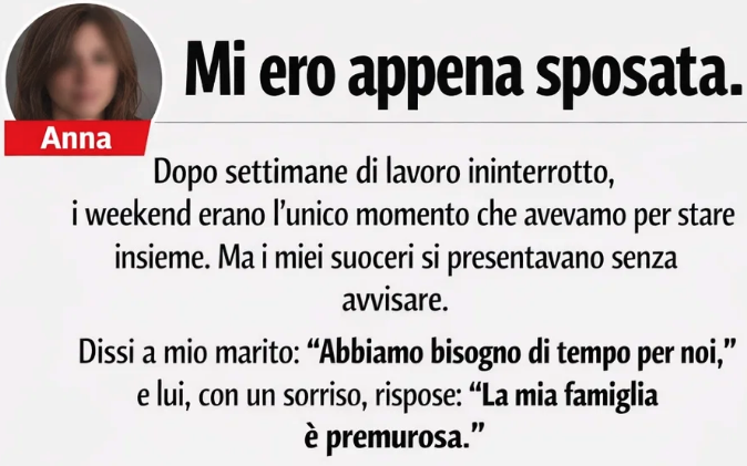 Mi ero appena sposata. Dopo settimane di lavoro ininterrotto, i weekend erano l’unico momento che avevamo per stare insieme. Ma i miei suoceri si presentavano senza avvisare. Dissi a mio marito: “Abbiamo bisogno di tempo per noi,” e lui, con un sorriso, rispose: “La mia famiglia è premurosa.”