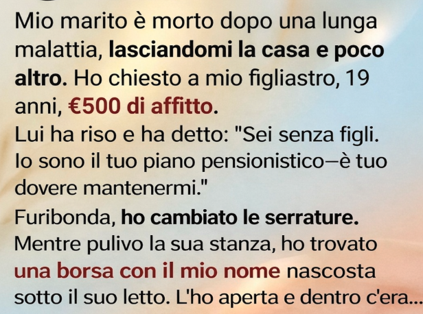 Mentre sistemavo la sua stanza, notai un borsone infilato sotto il letto, ordinatamente etichettato con il mio nome. Incuriosita e confusa, lo aprii. Dentro c’era un libretto di risparmio, con registrazioni di piccoli ma costanti versamenti fatti nel corso di diversi anni. Sotto, trovai un biglietto d’auguri piegato, scritto con la grafia attenta di Leo. Nel messaggio spiegava che aveva risparmiato in silenzio per aiutarsi a prendersi cura di me dopo la morte di suo padre. La battuta della sera prima, scriveva, era stato il suo modo impacciato di nascondere il piano finché non avesse sentito che era arrivato il momento giusto. Mentre leggevo, le lacrime mi offuscarono le parole. Compresi quanto il dolore e la paura avessero distorto la mia prospettiva — e quanto profondamente lui stesse pensando al mio futuro.
