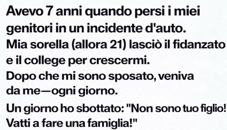 Lei divenne il mio tutto—mia madre, mia sorella, la mia protettrice. Faceva due lavori, preparava i miei pranzi, mi aiutava con i compiti, era a ogni recita scolastica, a ogni ginocchio sbucciato, a ogni delusione. Ma non uscì mai più con qualcuno. Non tentò mai di costruirsi una vita sua.