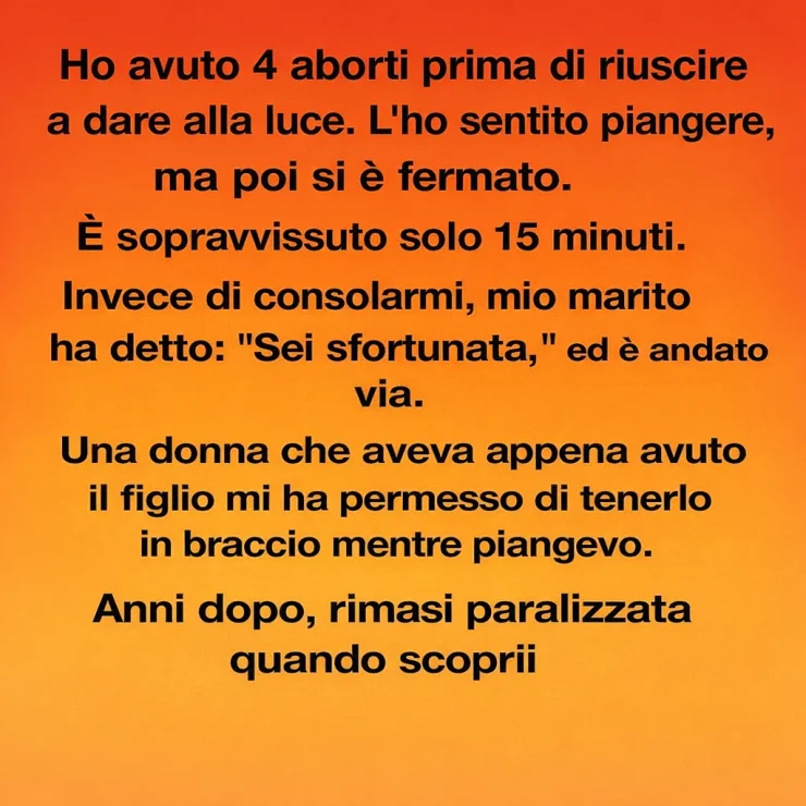 Ho avuto quattro aborti spontanei prima di riuscire finalmente a partorire. Per anni la mia vita è sembrata un ciclo infinito di speranza e dolore devastante, scandito da ecografie e appuntamenti medici che finivano sempre nel silenzio. Quando finalmente arrivai a termine con un bambino, pensai che la mia sorte fosse cambiata. Lo sentii piangere solo per un istante — un suono minuscolo e fragile — poi tutto si fermò. Sopravvisse solo quindici minuti.