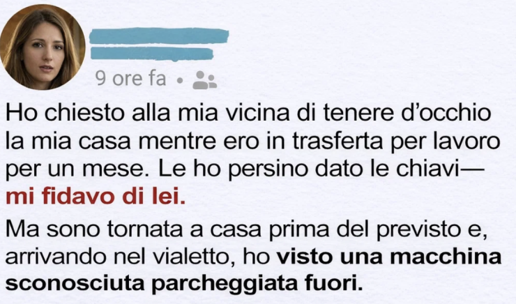 Ero partita per un viaggio di lavoro di un mese, fidandomi della mia vicina — e amica — perché si occupasse della casa. Ma quando sono tornata in anticipo, ho trovato un’auto sconosciuta nel vialetto… e una famiglia che cenava tranquillamente nella mia cucina.