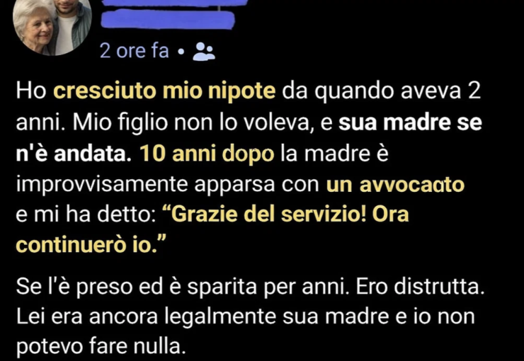 Ho cresciuto mio nipote da quando aveva due anni. Mio figlio non lo voleva, e sua madre era sparita senza lasciare traccia. Io sono diventata il suo mondo intero, e lui è diventato il mio. Preparavo i suoi pasti, lo cullavo durante gli incubi e guardavo le sue piccole mani crescere forti e sicure. Pensavo che la nostra piccola vita insieme sarebbe durata per sempre.