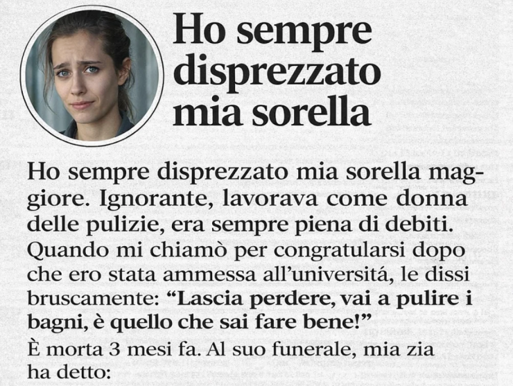 “Tua sorella ha fatto il sacrificio più grande della sua vita per te,” continuò. “Tua nonna aveva lasciato un’eredità—abbastanza per permettere a uno solo di voi due di studiare e costruirsi un futuro dignitoso. Solo uno.”