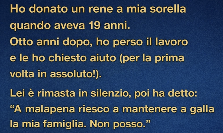 Ho donato un rene a mia sorella quando lei aveva 19 anni. Otto anni dopo, ho perso il lavoro e le ho chiesto aiuto (per la prima volta in assoluto!). Lei rimase in silenzio, poi disse: “A malapena stiamo tenendo a galla la nostra stessa famiglia. Non posso.” Ho pianto nel parcheggio. Il mio cuore si fermò quando suo marito mi chiamò e mi disse, “Devi venire in ospedale.”