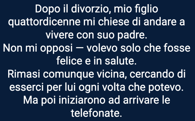 Non perché lo volessi davvero — in realtà, lo avrei tenuto con me ogni giorno se avessi potuto — ma perché non volevo ostacolare un legame tra padre e figlio che cercava di ricomporsi. Lo avrei comunque visto nei fine settimana, o quando voleva. Solo, non sarebbe stato con me tutti i giorni.