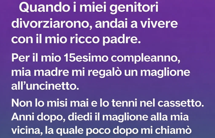Al mio quindicesimo compleanno venne con una piccola busta regalo. Dentro c’era un maglione lavorato all’uncinetto, che aveva chiaramente fatto lei. Era semplice—color crema, un po’ irregolare, quel tipo di cosa che un adolescente non sfoggerebbe con orgoglio. Io mormorai un veloce “grazie” ed evitai il suo sguardo. Non disse nulla, ma vidi come le sue mani si trattennero solo un attimo in più sul filato prima di lasciarlo andare.