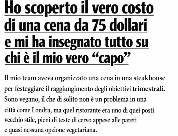 Il mio team aveva organizzato una cena in una steakhouse per festeggiare il raggiungimento degli obiettivi trimestrali. Sono vegano, il che di solito non è un problema in una città come Londra, ma quel ristorante era uno di quei posti vecchio stile, pieni di teste di cervo appese alle pareti e quasi nessuna opzione vegetariana. Quando chiesi al mio capo, Marcus, come avrei potuto gestirla, scrollò le spalle e disse: «È una steakhouse, Arthur. Ordina qualcosa dai contorni.»