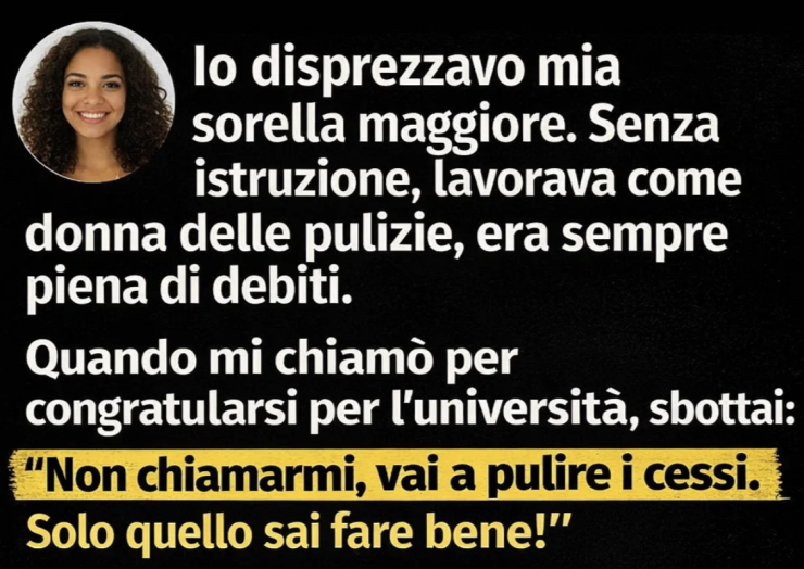 Mia zia spiegò che mia sorella aveva lavorato come donna delle pulizie e rinunciato a un’istruzione perché voleva che io avessi quelle opportunità. Aveva fatto promettere a tutti di non dirmelo. Non voleva farmi sentire in colpa, né mettermi pressione. Voleva solo che io avessi successo.