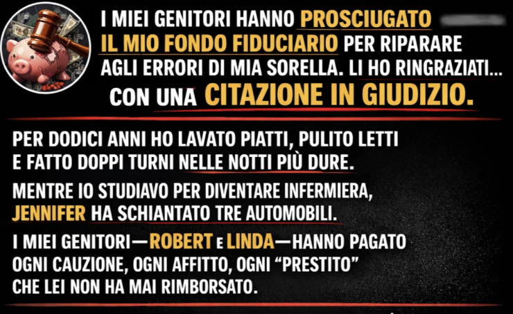 Per dodici anni ho lavato piatti, pulito letti e fatto doppi turni nelle notti più dure. Mentre io studiavo per diventare infermiera, Jennifer ha schiantato tre automobili. I miei genitori—Robert e Linda—hanno pagato ogni cauzione, ogni affitto, ogni “prestito” che lei non ha mai rimborsato.