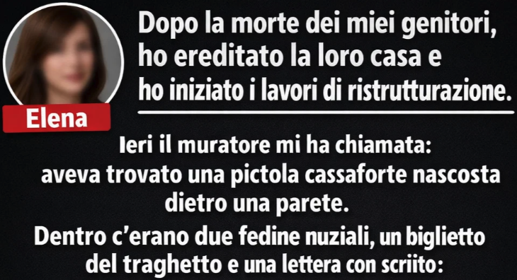 Dopo la morte dei miei genitori, ho ereditato la loro casa e ho iniziato i lavori di ristrutturazione. Ieri il muratore mi ha chiamata: aveva trovato una piccola cassaforte nascosta dietro una parete. Dentro c’erano due fedine nuziali, un biglietto del traghetto e una lettera con scritto: “Se hai trovato questo, il piano è fallito.”