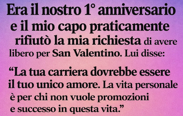 Era il nostro 1° anniversario, e il mio capo praticamente rifiutò la mia richiesta di avere libero a San Valentino. Disse: “La tua carriera dovrebbe essere il tuo unico amore. Le vite personali sono per le persone che non vogliono promozioni e successo in questa vita.” Io dissi: “Giusto. Ok!” Ma il giorno dopo, mi immobilizzai quando trovai un piccolo biglietto scritto a mano infilato nella tasca laterale della mia borsa per laptop.