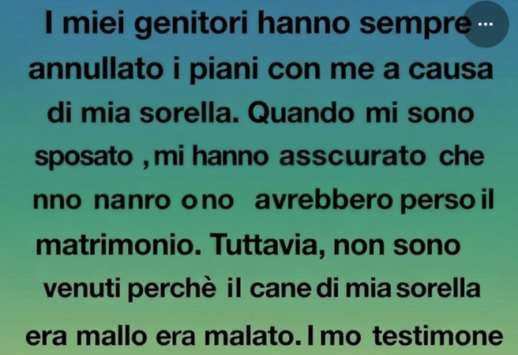 I miei genitori hanno sempre annullato gli impegni con me a causa di mia sorella. Quando mi sono sposato, mi assicurarono che non avrebbero mancato per nulla al mondo. E invece non vennero, perché il cane di mia sorella stava male. Il mio testimone di nozze pubblicò un video online dicendo che ero una persona straordinaria e che i miei genitori non c’erano mai stati per me. Quando lo videro, mi accusarono di essere egoista per aver permesso che questioni “private” venissero esposte pubblicamente.