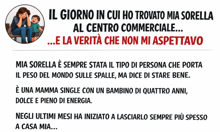 Mia sorella è sempre stata il tipo di persona che porta il peso del mondo sulle spalle, ma dice di stare bene. È una mamma single con un bambino di quattro anni, dolce e pieno di energia. Negli ultimi mesi, ha iniziato a lasciarlo sempre più spesso a casa mia—talvolta avvisando, altre volte no. Le scuse erano sempre strane: “Una chiamata di lavoro all’improvviso”, “Devo incontrare un’amica per una cosa urgente”, “Ha bisogno di cambiare ambiente”. Io non mi sono mai tirata indietro—è famiglia—ma sentivo che c’era qualcosa di non detto.