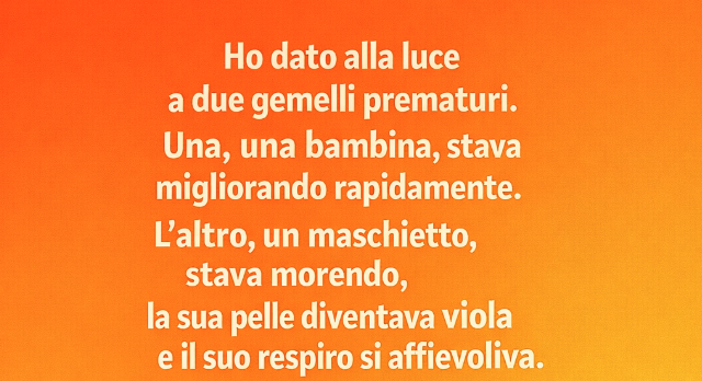 Avevo dato alla luce due gemelli prematuri. Una, la femmina, migliorava rapidamente. L’altro, il maschietto, stava morendo: la pelle gli diventava violacea e il respiro si faceva sempre più debole. Piangevo accanto all’incubatrice, guardandolo forse per l’ultima volta.