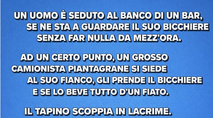 «Dai, amico, stavo solo scherzando. Ti offro un altro da bere. Non sopporto vedere un uomo piangere.»