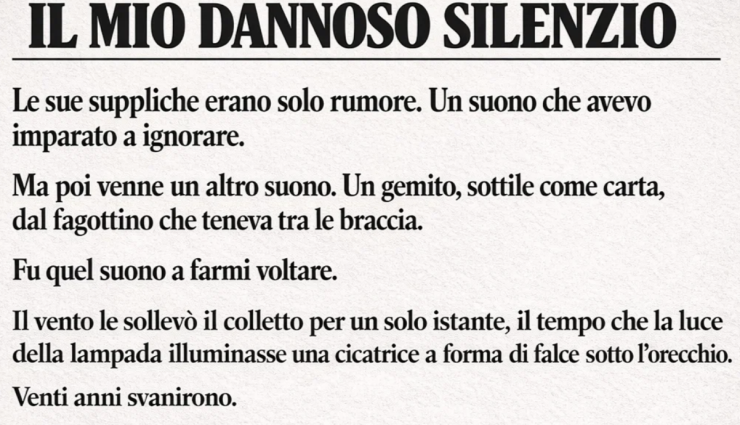 «Era malata da tanto,» continuò, la voce un sussurro. «Tosse. I medici dicevano che erano i polmoni. Che aveva lavorato troppo in posti umidi.»