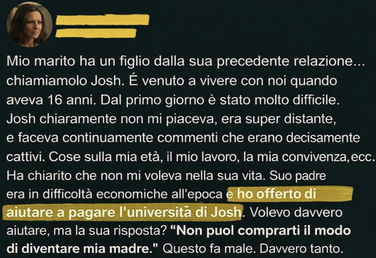 Quando il mio figliastro, ostile e rabbioso, ha respinto con crudeltà la mia offerta di pagargli l’università — sputandomi addosso: “Non puoi comprarti il ruolo di mamma” — ho fatto un passo indietro e l’ho lasciato andare.