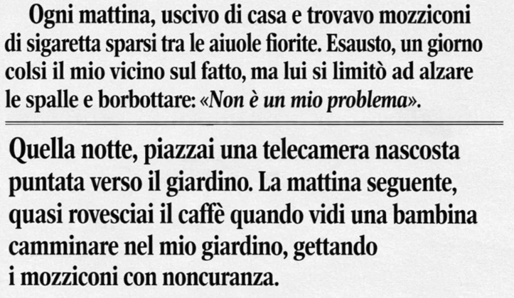 Ogni mattina, uscivo di casa e trovavo mozziconi di sigaretta sparsi tra le aiuole fiorite. Esausto, un giorno colsi il mio vicino sul fatto, ma lui si limitò ad alzare le spalle e borbottare: «Non è un mio problema». Quella notte, piazzai una telecamera nascosta puntata verso il giardino. La mattina seguente, quasi rovesciai il caffè quando vidi una bambina camminare nel mio giardino, gettando i mozziconi con noncuranza.