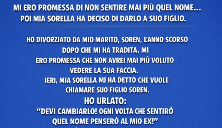 Ho divorziato da mio marito, Soren, l’anno scorso dopo che mi ha tradita. Mi ero promessa che non avrei mai più voluto vedere la sua faccia. Ieri, mia sorella mi ha detto che vuole chiamare suo figlio Soren. Ho urlato: “Devi cambiarlo! Ogni volta che sentirò quel nome penserò al mio ex!” Lei è rimasta in silenzio.