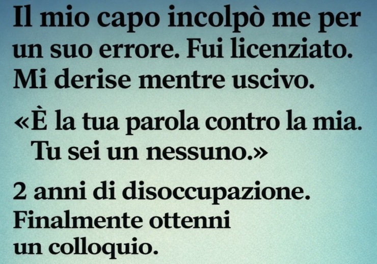 Il mio capo ha dato la colpa a me per il suo errore. Sono stato licenziato. Lui ha sogghignato mentre uscivo. «È la tua parola contro la mia. Non sei nessuno.» Due anni di disoccupazione. Finalmente ho ottenuto un colloquio. Sono entrato — ed eccolo lì. Ma il suo viso è diventato bianco quando ha capito che non ero lì per essere intervistato da lui. Ero lì per essere presentato come il nuovo consulente regionale chiamato a fare l’audit del suo intero reparto.