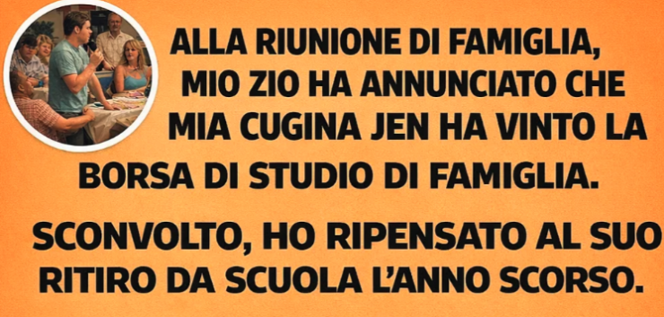 Alla riunione di famiglia, mio zio annunciò che mia cugina Jen aveva vinto la borsa di studio di famiglia. Rimasi scioccata: ricordavo benissimo che aveva abbandonato l’università l’anno precedente. Protestai, ma tutti liquidarono i miei dubbi come un malinteso.
