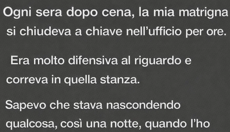 Ogni sera dopo cena, la mia matrigna si chiudeva a chiave nello studio per ore. Era sulla difensiva a riguardo, e correva in quella stanza come se fosse una specie di bunker ad alta sicurezza. Helena aveva sposato mio padre circa tre anni fa e, per la maggior parte, andavamo abbastanza d’accordo. Era gentile, faceva delle lasagne eccezionali e non ha mai cercato di sostituire la mia madre biologica, che era morta quando avevo dieci anni. Ma questo suo rituale notturno stava iniziando a creare una spaccatura tra noi.