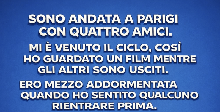 Ero andata a Parigi con quattro amiche. Avevamo programmato tutto da mesi. Ma il secondo giorno mi venne il ciclo, così rimasi in appartamento a guardare un film mentre le altre uscivano.