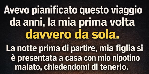 Avevo pianificato questo viaggio per anni, il mio primo vero tempo da sola. La sera prima di partire, mia figlia si è presentata con mio nipote malato, chiedendomi di tenerlo. «Mamma, per favore,» ha detto, «la famiglia viene prima di tutto.» Le ho promesso che l’avrei aiutata, ma, senza avvisarla, quella notte ho comunque preparato la valigia.