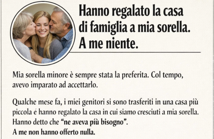 Mia sorella minore è sempre stata la preferita. Col tempo, avevo imparato ad accettarlo. Qualche mese fa, i miei genitori si sono trasferiti in una casa più piccola e hanno regalato la casa in cui siamo cresciuti a mia sorella. Hanno detto che “ne aveva più bisogno”. A me non hanno offerto nulla. La settimana scorsa, mi hanno chiamato per chiedermi aiuto con i lavori di ristrutturazione della loro nuova casa. Ho detto di no. Sono rimasti scioccati e mi hanno accusato di essere ingrato e distante.