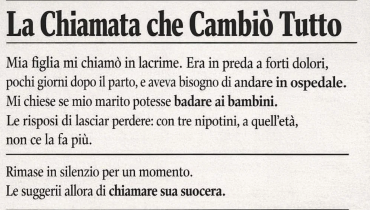 Non la richiamai subito. Rimasi seduta a fissare la TV che mandava repliche vecchie. Mio marito mi guardò, capendo che qualcosa non andava.