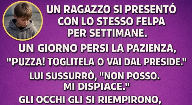 Un rimprovero in classe per una felpa “sempre uguale” apre un caso sociale: lutto, difficoltà economiche, raccolta abiti anonima e un progetto scolastico sostenuto da fondazione.