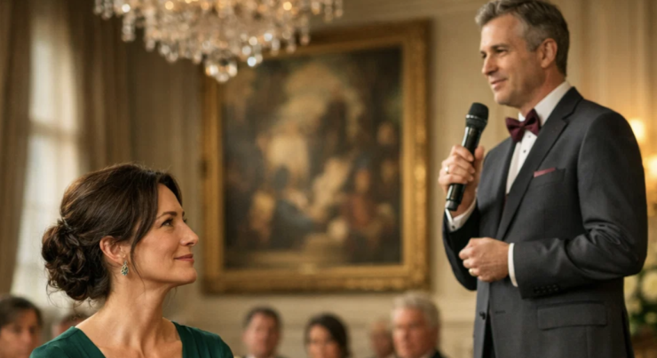 “Mi scuso per l’interruzione,” disse, la voce amplificata dagli altoparlanti. “Ma prima che questo continui, c’è qualcosa che dovete sapere sulla donna che quest’uomo ha appena definito ‘fortunata.’”
