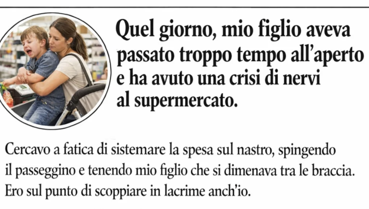 Quel giorno, mio figlio aveva passato troppo tempo all’aperto e ha avuto una crisi di nervi al supermercato. Cercavo a fatica di sistemare la spesa sul nastro, spingendo il passeggino e tenendo mio figlio che si dimenava tra le braccia. Ero sul punto di scoppiare in lacrime anch’io. Poi una donna si è avvicinata. Mi sono irrigidita, pronta a ricevere un sospiro o uno di quei consigli benintenzionati ma giudicanti sull’essere madre.