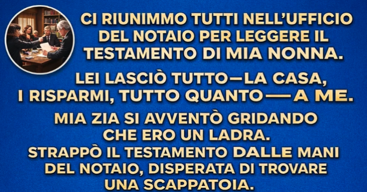 Ci siamo riuniti tutti nello studio dell’avvocato per leggere il testamento di mia nonna. Aveva lasciato tutto—la casa, i risparmi, TUTTO—a me. Mia zia si è lanciata in avanti urlando che ero una ladra.